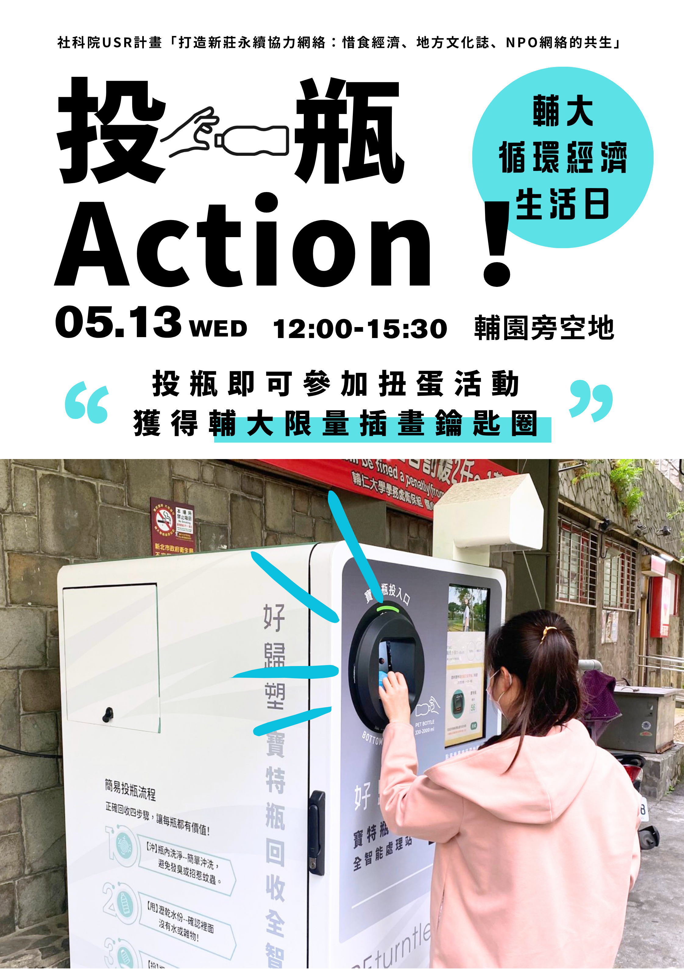 只要帶著你的空寶特瓶來現場完成投瓶,並在IG動態打卡標註「我在輔仁Re-Action循環經濟生活日!」同時Tag「轉瓶計劃」IG帳號,就能獲得一次扭蛋機會,快來把限量「輔大小物x羅甯與黃鼠狼插畫鑰匙圈」帶回家吧!